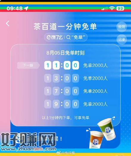 饿了么搜免单今天是茶百道有四场11:00,2000人13:00,2000人17:00,2000人19:00,2000人最高可免39元,可叠加红包使用饿了么搜【78188】可领消费日红包饿了么搜【78999】可领店铺可叠加红包新的免单周期8.2-8.8,活动期间只能免一次