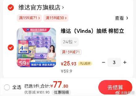 先领2张补帖卷 ,维达立体美抽纸24包/箱