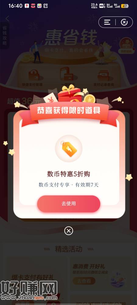 建行app首页 右上角信封-优惠活动-去看看历史推送有没有“数币抵扣省钱卡”道具 我进去就可以领了