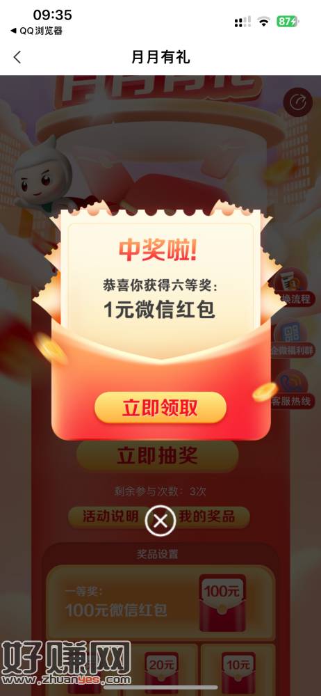 【掌银】惠享红包,月月有礼,最高可抽微信红包100元,戳