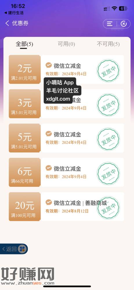 建行生活,主页,我的,拉到最下面,最低0.99抽36元微信立减金。