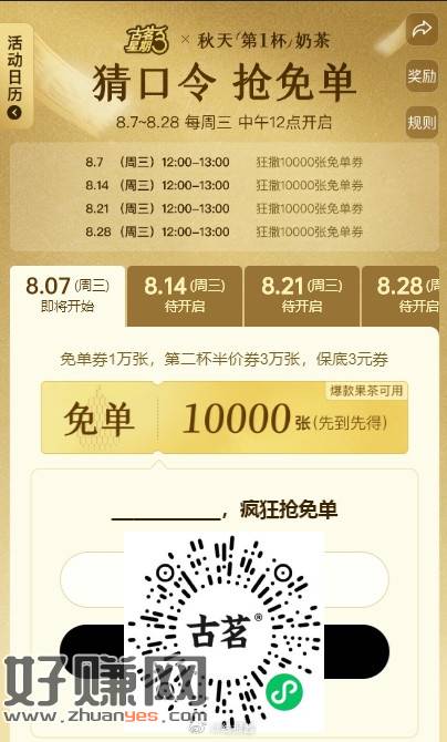明天12点,古茗有1万张免单券,口令预计:古茗星期三