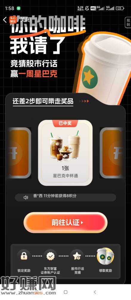 东方财富股市竞猜,可以领一张星巴克中杯通兑券