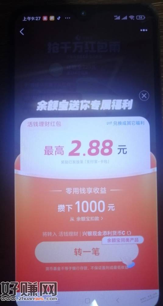 余额宝进去,福利日红包雨,空仓的2.88,可货基1000抵。