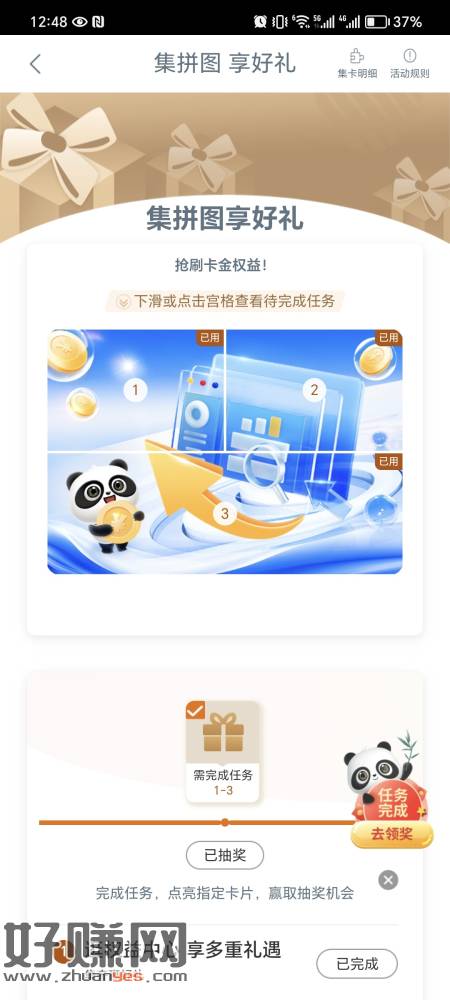 限工行信用卡 工银e生活APP-我的-我的任务-e起做任务-集拼图 享好礼,完成3个浏览任务就可以抽奖,亲测5元刷卡金。
