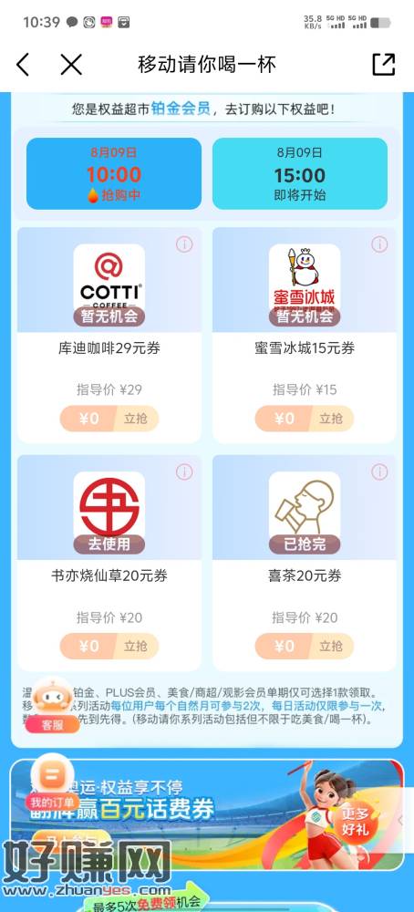 移动 铂金会员记得去领 优先抢喜茶,抢不到再抢书亦烧仙草