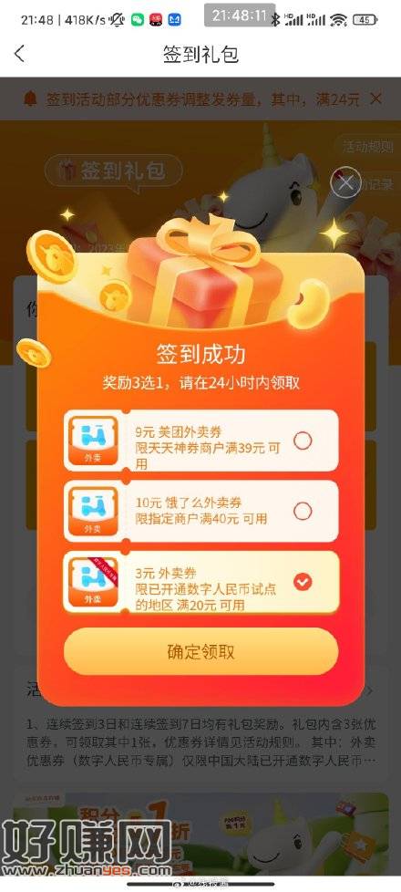 建行生活签到三天是数币20-2,签到七天是数币20-3