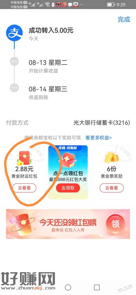 余额宝从银行卡转入,会弹出来个2.88黄金红包,满10可用,第二天赎回即可