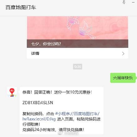 百度地图打车公众号回复六周年快乐,有10打车券