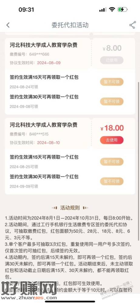 工行App搜生活缴费-学杂费-河北科技-编号随便填,开通代扣,领取缴费红包取消掉