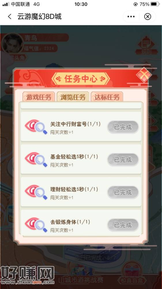 进去福仔云游记 往下看找到云游重庆 进去玩下游戏 很简单 玩到最后三关送的高级宝箱开出来的纪念品就是兑换10.88立减金的 游戏次数不够里面任务中心 有几个浏览任务 点一下返回就行了 一个号三个纪念品 要玩5个号 然后全交换给领立减金的那个号
