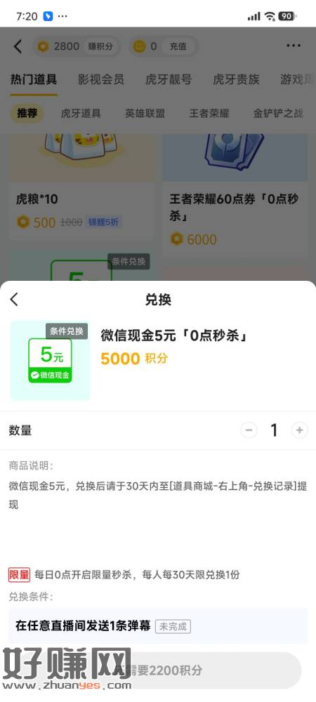 虎牙直播 5000积分兑5现金 呆在直播间卡在12点随便发条