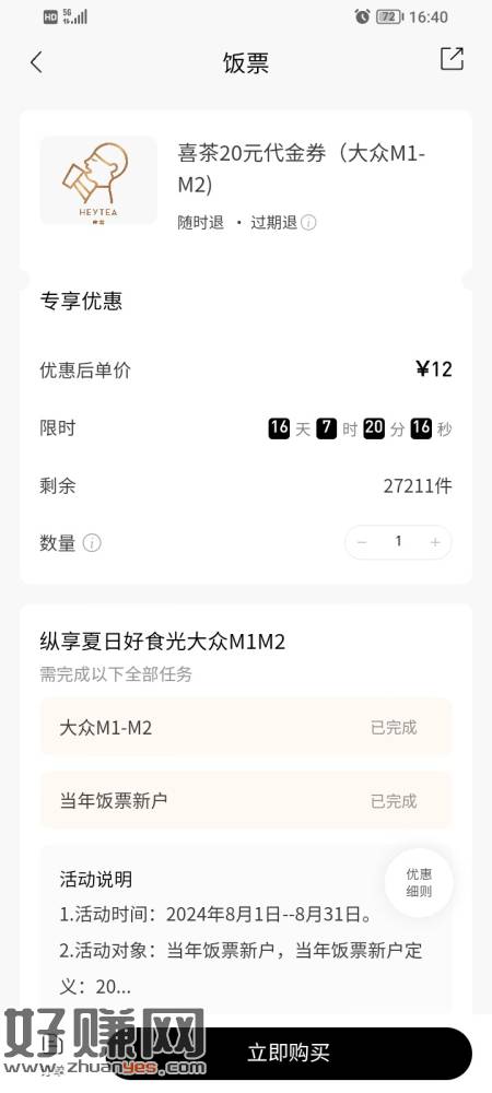 招商APP今年没买过饭票的才行,大众M1会员12 买20喜茶代金券可出