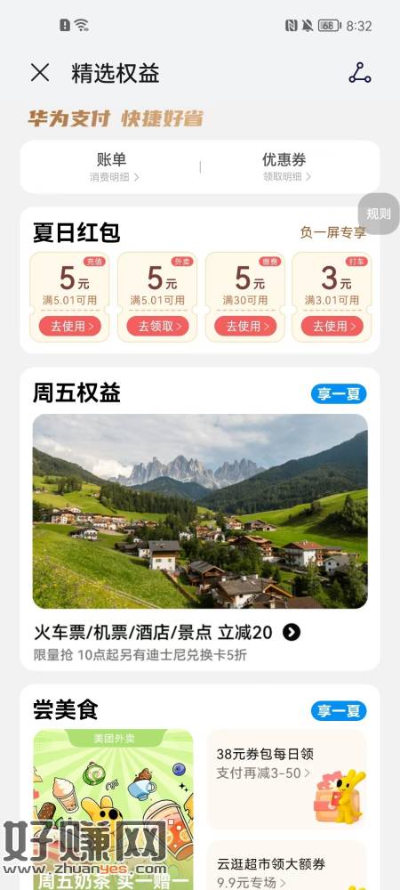 华为手机负一屏,领电费30减5,手机话费减5红包