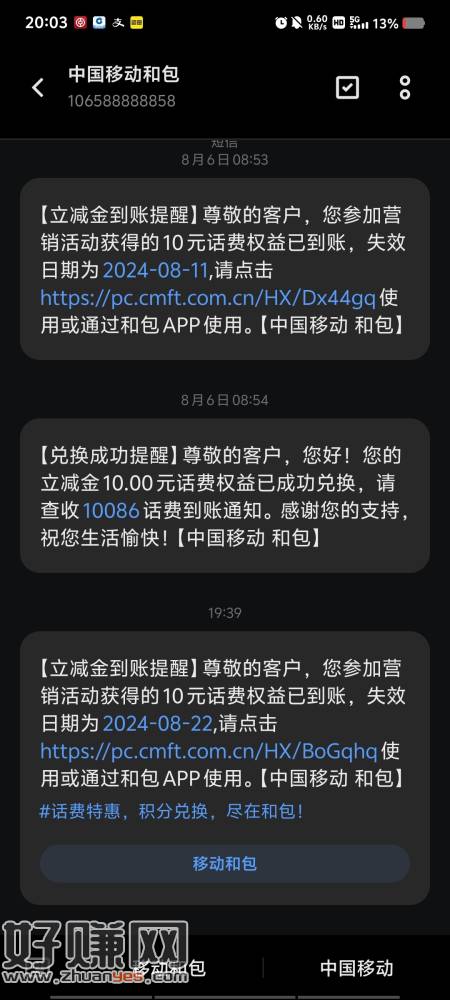 【立减金到账提醒】尊敬的客户,您参加营销活动获得的10元话费权益已到账,失效日期为 2024-08-22,请点击