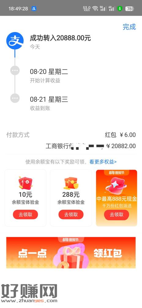 6r小毛 zfb搜818理财节 抽中6红包 直接余额宝20888无损
