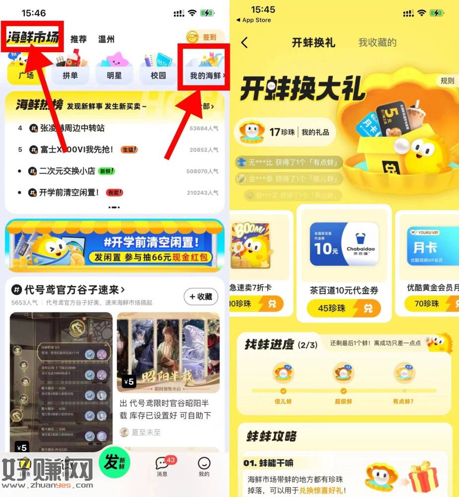 【咸鱼每日开蚌换10亓奈雪】咸鱼APP顶部“海鲜市场”->我的海鲜->根据提示,每天浏览得2个倍儿蚌,发布有超级蚌,大概每2~3天即可换10亓奈雪然后鱼出