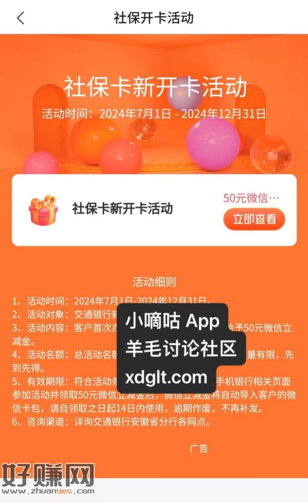 交通银行App“生活”频道位置切换到合肥,社保专区——社保卡开卡有礼活动——领50元微信立减金。都去试试,外地的卡也能领。