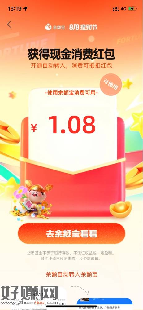 支付宝首页818横幅进去抽卡片得余额宝1.08红包 记得先关