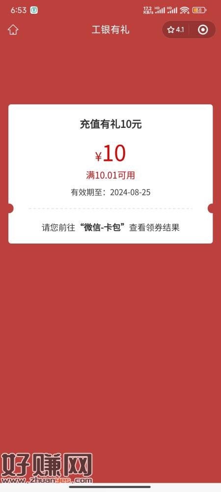 工行兴农通充值有礼,还没做这个任务的去做,充500,刚中了10立减金