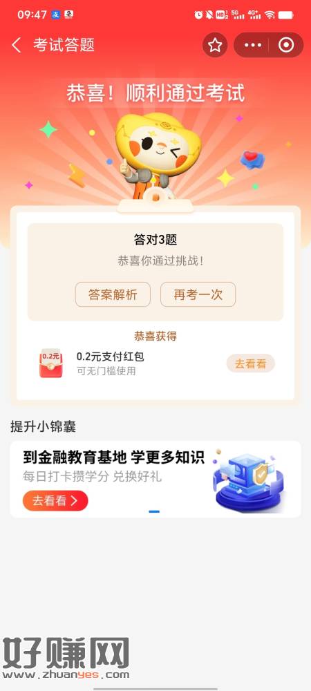 支付宝搜索“金融教育基地”,打开第一个小程序,回答三道题,可以拿0.2元无门槛支付红包