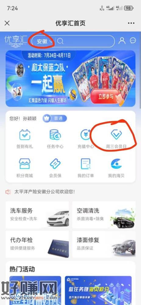 右下优享会进,左上地址改安徽,然后点周三会员进