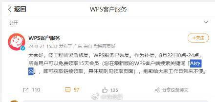 #WPS补偿15天会员# 8月22日0点-24点,所有用户可以免费领取15天会员(您在最新版的WPS客户端搜索关键词「AI办公」,即可获取链接领取