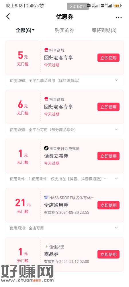 最近没在抖音商城买过东西的,去抖音商城里停留一会,去试下,给我送了2张卷,1个6,1个5