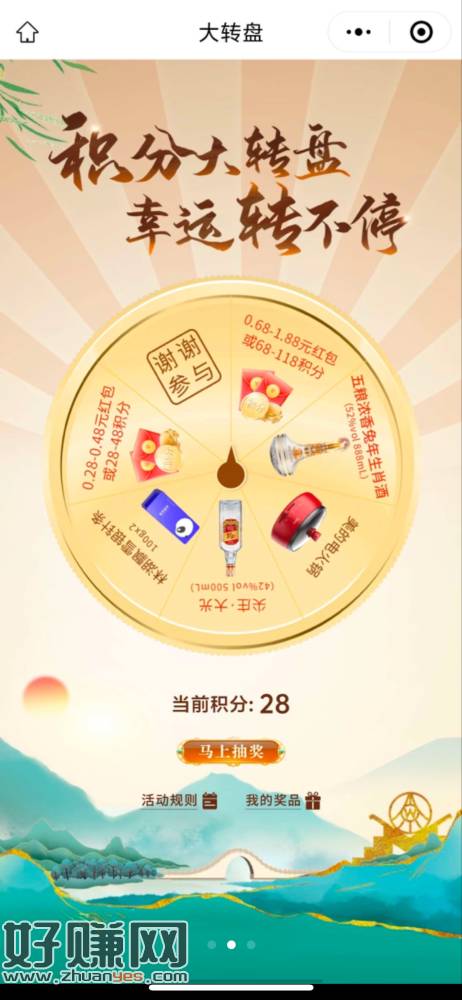 【参与方式】微信小程序搜索农五的酒馆 点击积分商城 转盘抽奖 前三次50积分抽一次 后三次100积分一次 完善资料可以额外获得100积分(乱填)
