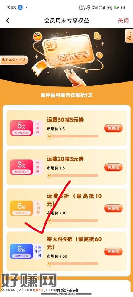 10点,顺丰App或者小程序,会员中心有六折,月限