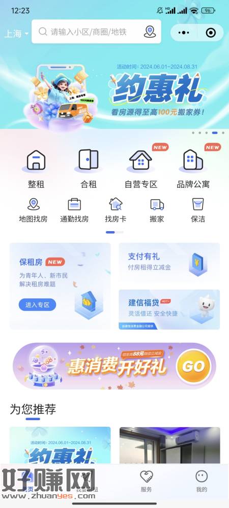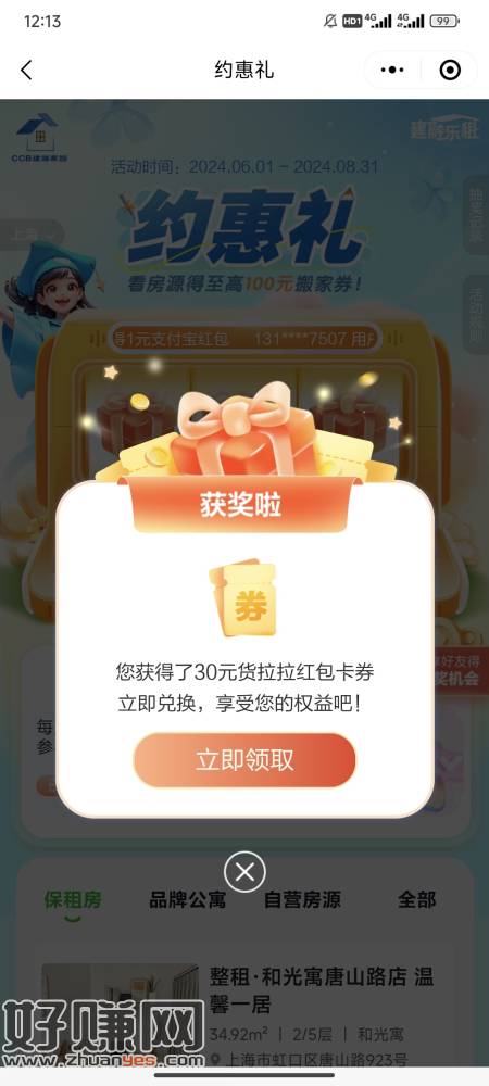 CCB建融家园小程序,左上角选上海然后这个横幅抽奖,抽的的去货拉拉APP里优选商城买e卡