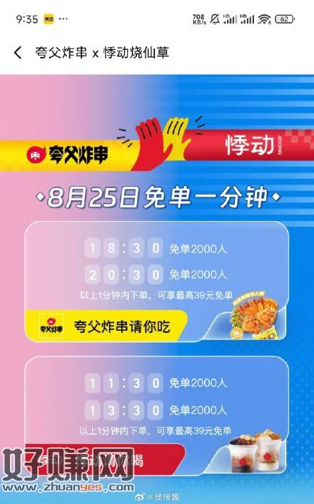 饿了么搜免单,今天是夸父炸串和悸动11:30,悸动免单2000人13:30,悸动免单2000人18:30,夸父免单2000人20:30,,夸父免单2000人最高39,本次周期是8.23-8.29,周期内一次