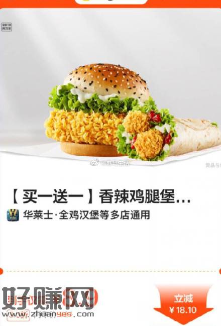 华莱士8.9亓汉堡买一送一,到手是鸡腿堡鸡肉卷