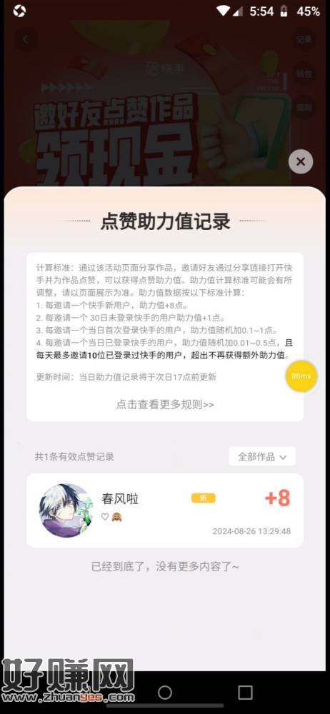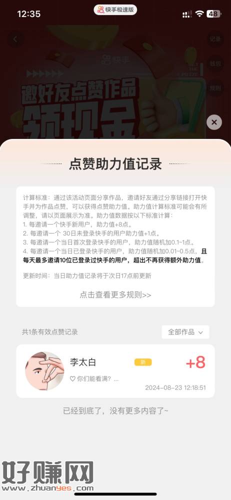 发一个作品分享小号点赞,他规定的是点赞的必须是新号新设备没下载过极速的,我已经拿2个了,继续搞,一个老号点赞的一个Z.x重新注册的小号点赞的,设备用天翼云手机每天有一个新的5小时设备。是否需要新号不太确定,反正我是一个老号一个Z.x的小号,设备应该是必须新。次日下午4.30-5点左右到账。