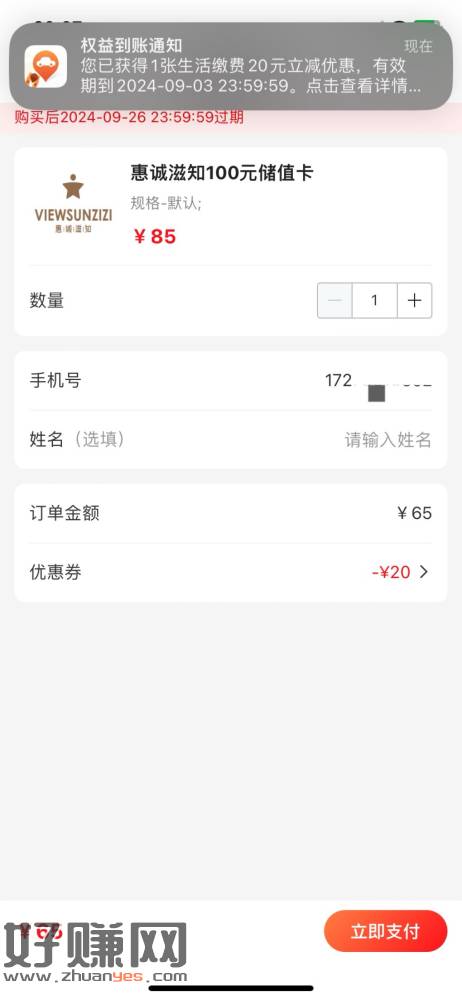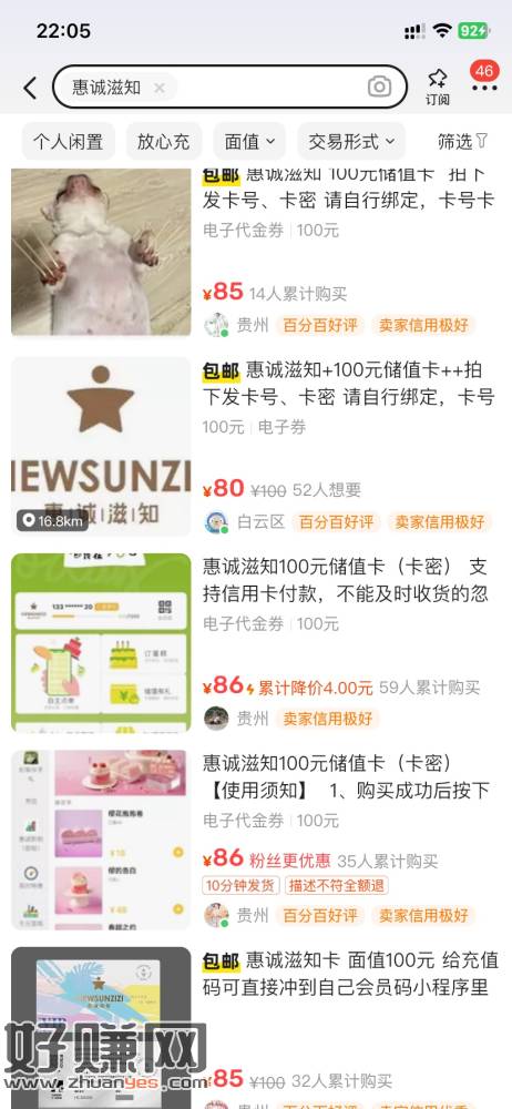 用没注册过平安好车主的手机号注册先,然后下载多彩宝app首页生活缴费下拉,抢立减金,用刚注册平安的手机号领取,然后回好车主卡卷立即兑换使用,复制优惠卷兑换码回多彩宝,我的,我的优惠卷,兑换,然后首页下拉,惠诚滋知储值卡点进去购买,65买100储值卡,每个多彩宝号只能兑换一次20卷,我领4个号,领20卷需要好车主没注册过的手机号,先把能领的手机号全部领了,然后挂鱼有人拍再去买储值卡,鱼是85价格,可以挂低一点也没事有润就行。