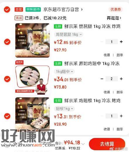 先领3张券 ,鲜京采 鸡翅根 1kg;拍1