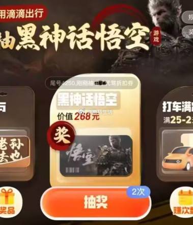 【滴滴出行黑神话抽打车满减券】微信打开活动->8月30日~9月8日每天2次机会,抽10减5亓打车满减券