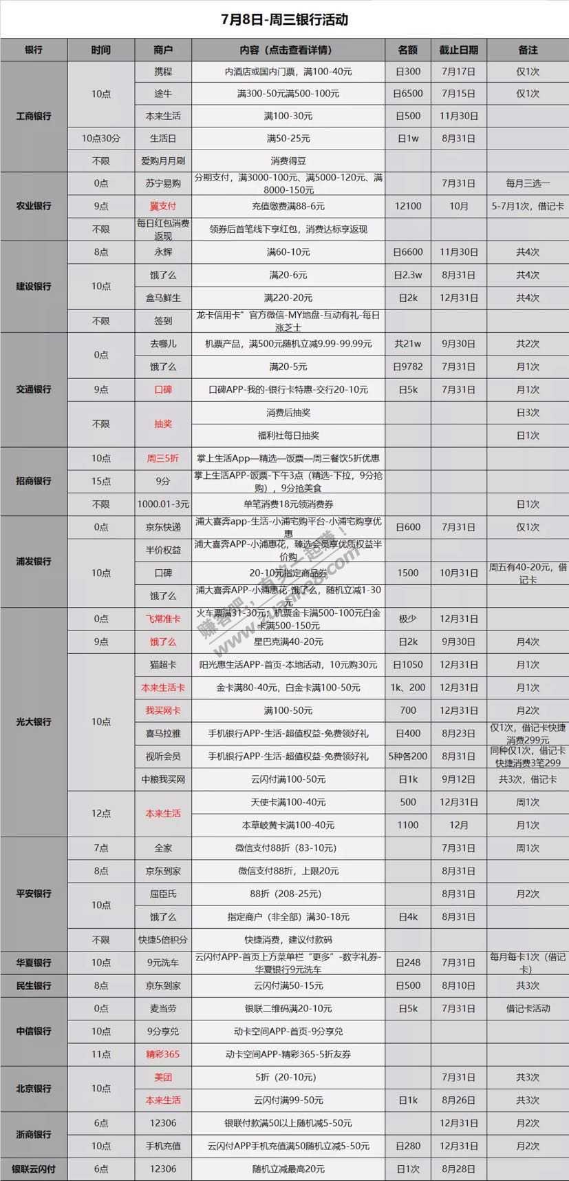 每日,在指定商户使用微信绑卡消费,可享满减优惠,每周各限1次,每日名额有限(7月31日截止)