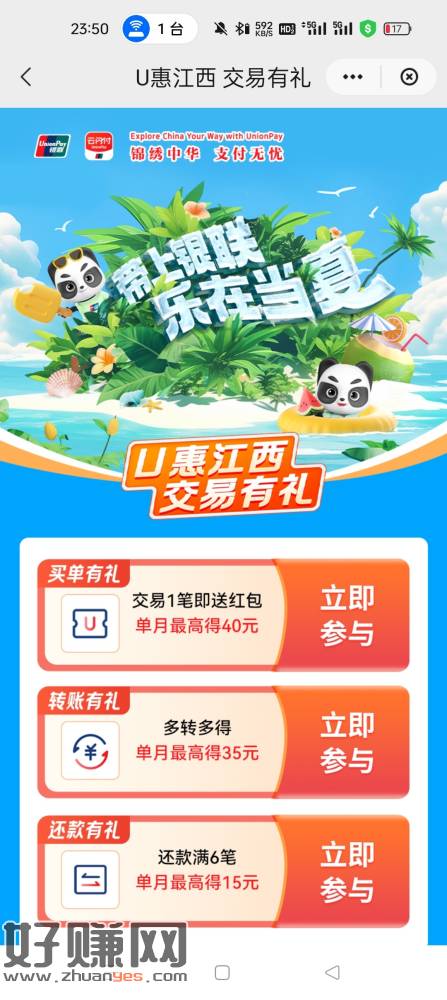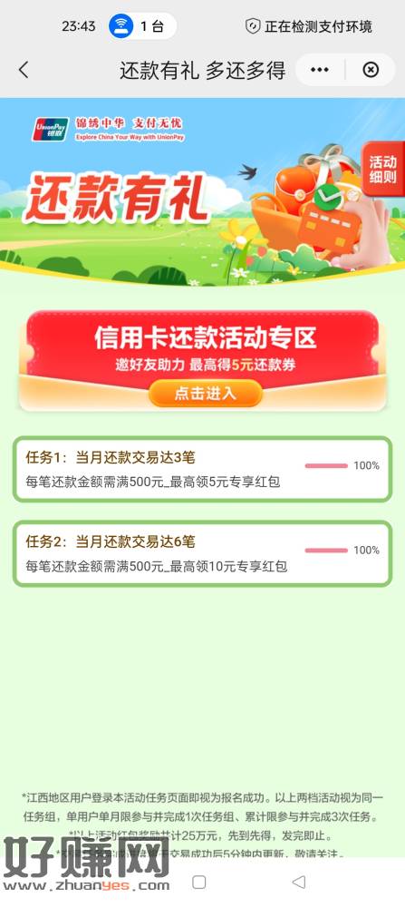 江西云闪付17毛,用云闪付还款6笔五百及以上领15毛,另外顺便用浦发银行还款100-2的,2毛,一共17,信用卡第二天溢缴款转出,全程无损