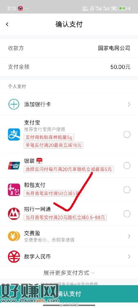 网上国网冲50电费,和包支付有50-5