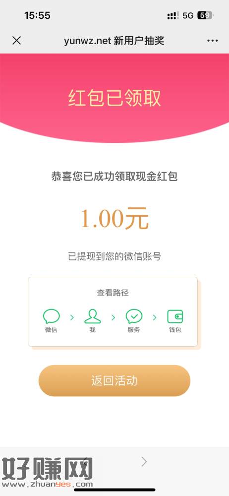 在PC电脑端(手机端无法参与)打开 yunwz.net 点击新人红包,即可获取一元红包,每人限领一次