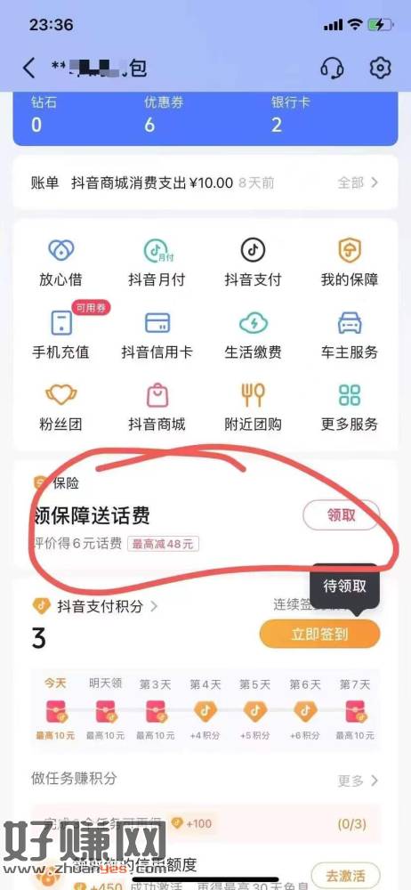 dy 我的钱包 下拉 部分号有评论得6元无门槛券话费 买完保险就退就得 多号多做