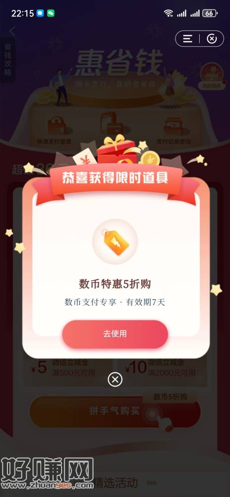 建行app搜关键词“惠省钱”,可以花9.9元购买36元微信立减金,部分用户弹数字币5折只需要4.99元就可购买36元立减金,现在加赠2张卷分别是500减5和2000减10的立减券