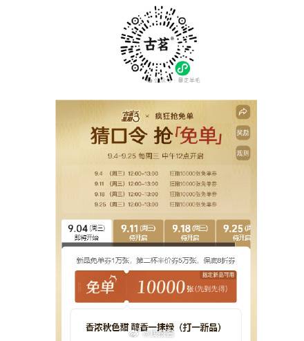 12点,古茗免单1w张,口令预计:抹茶布蕾