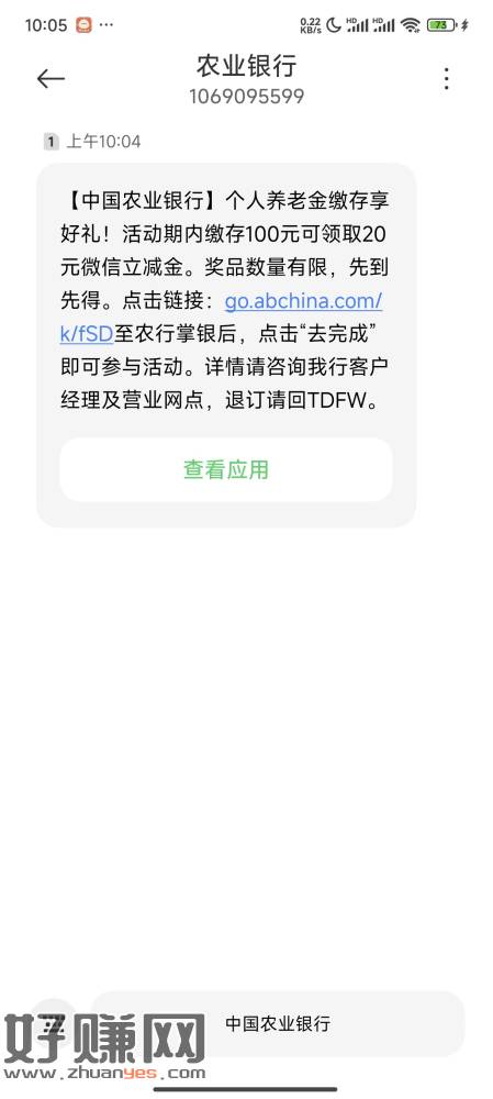需要的去【中国农业银行】个人养老金缴存享好礼!活动期内缴存100元可领取20元微信立减金。奖品数量有限,先到先得。点击链接:go.abchina.com/k/fSD至农行掌银后,点击“去完成”即可参与活动。详情请咨询我行客户经理及营业网点,退订请回TDFW。