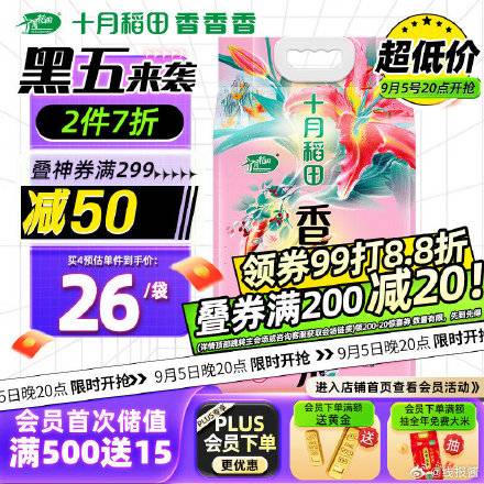 先领2张券 ,plus4件89,十月稻田 香稻贡米 5kg