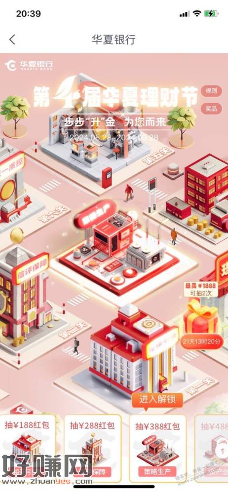 活动路径:华夏银行APP首页中部滚动图“玩转理财工厂,抽1888元红包”