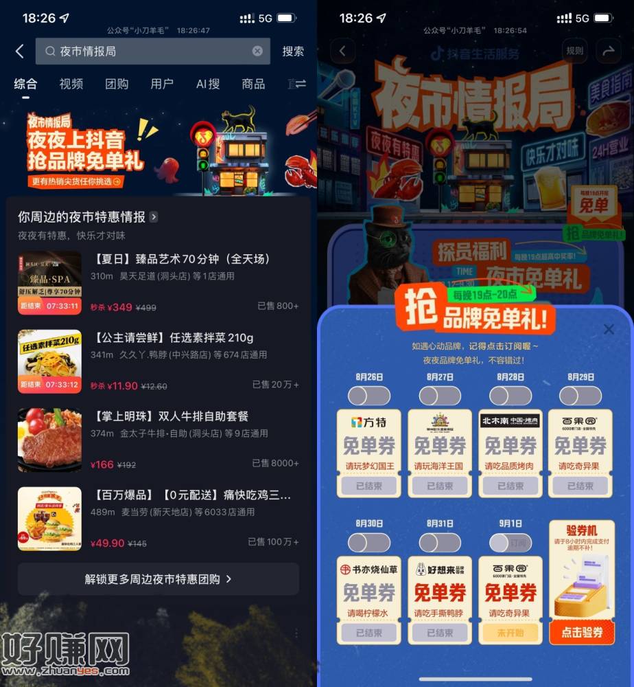 【抖音夜市情报局每天19点抢免单】抖音APP搜索“夜市情报局”->每天19点整抢品牌免单券,可0.01亓买大牌实物或门票