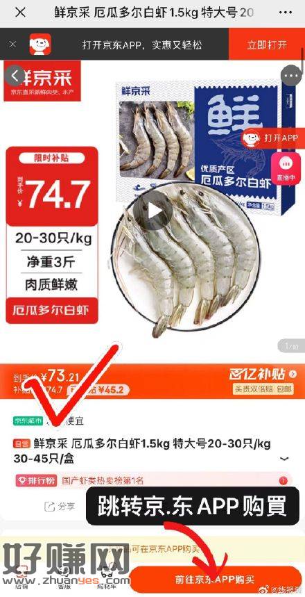 百补73.2,鲜京采 厄瓜多尔白虾1.5kg