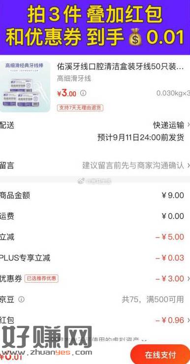【京东0.01亓撸3盒牙线共150只】先去京东抽1亓购物红包->再去领取9减3亓券->最后加入3盒牙线到购物车,再去拍下即可
